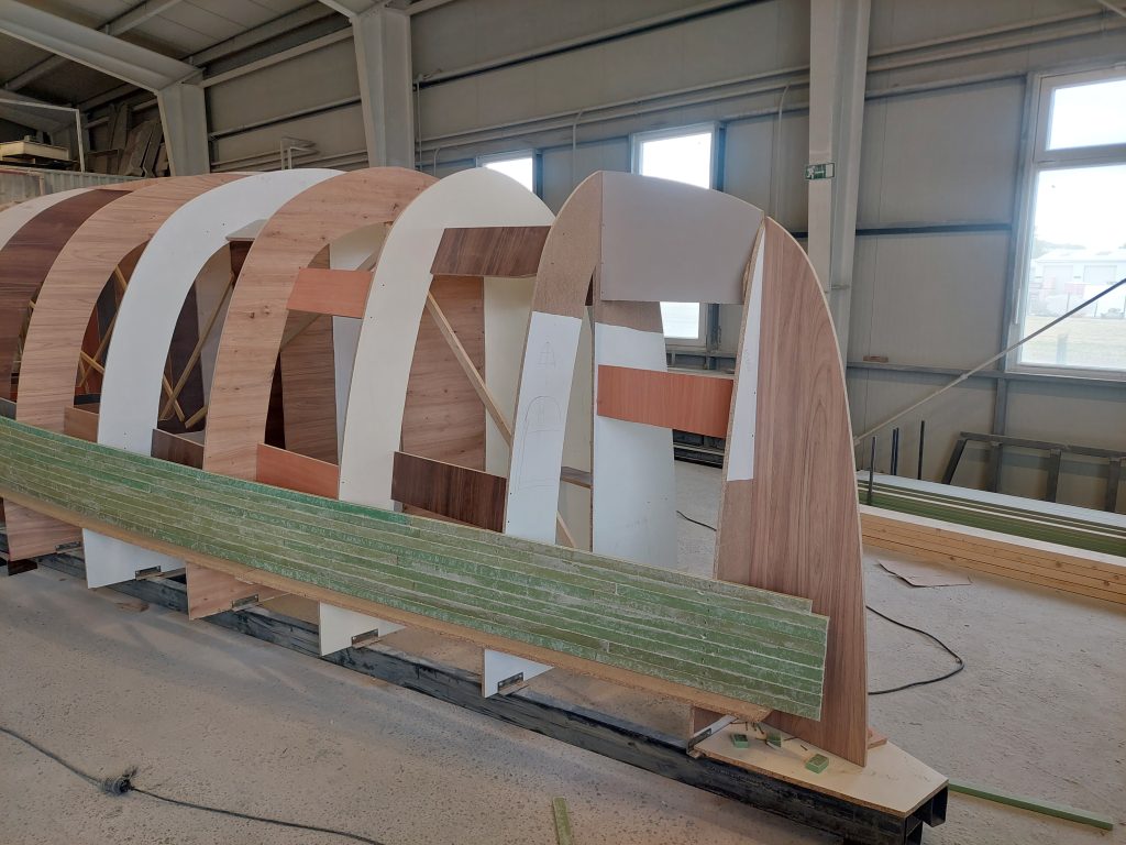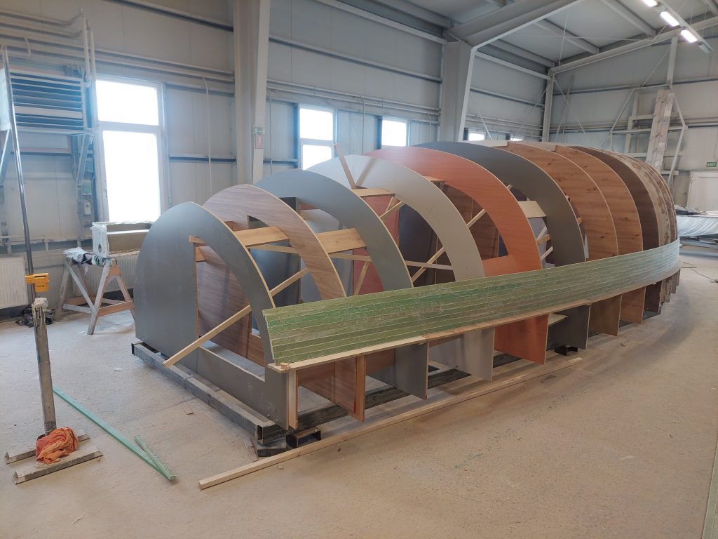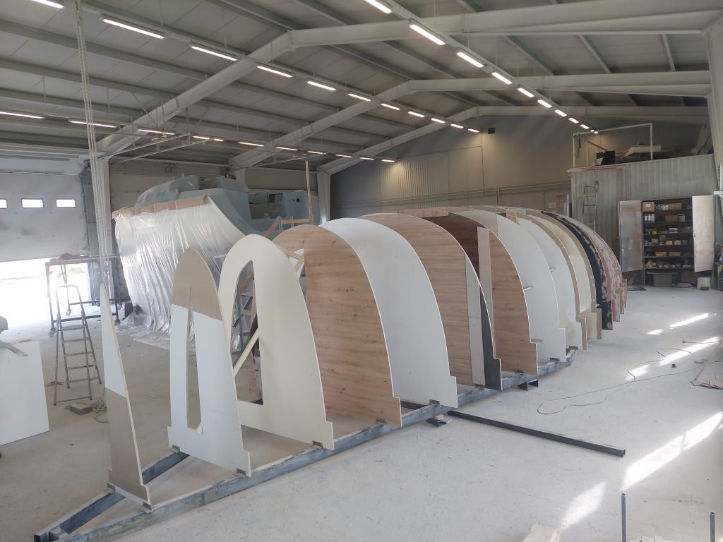 Így fest a felállított bordaváz. Az egyes elemek kiszabásánál és pontos beállításánál a számítógépes, 3D modell technológia, valamint egy lézer nagy segítség, ha egyből hajótestet szeretnénk készíteni. A habmarásos digitális ősminta gyártás lényegesen könnyebb, de ezúttal nem sablont gyártunk. Sok munkafázis hasonló, vagy megegyező, a kialakuló forma is teljesen ugyanaz, de esetünkben a majdani palánkozás, már a végleges hajótestet eredményezi.