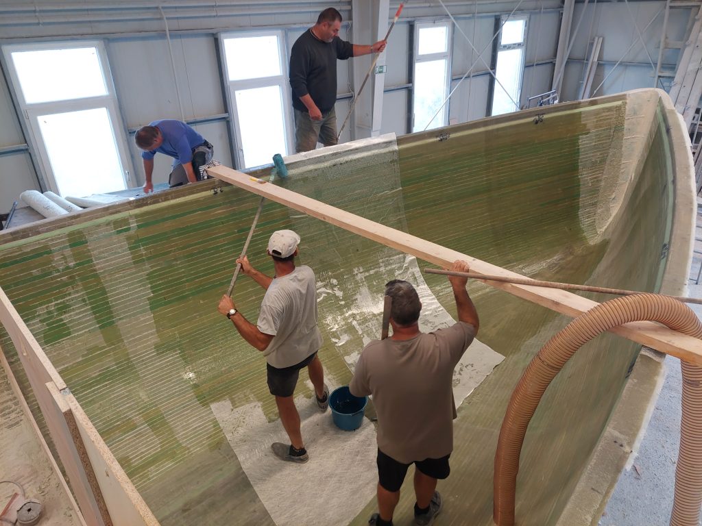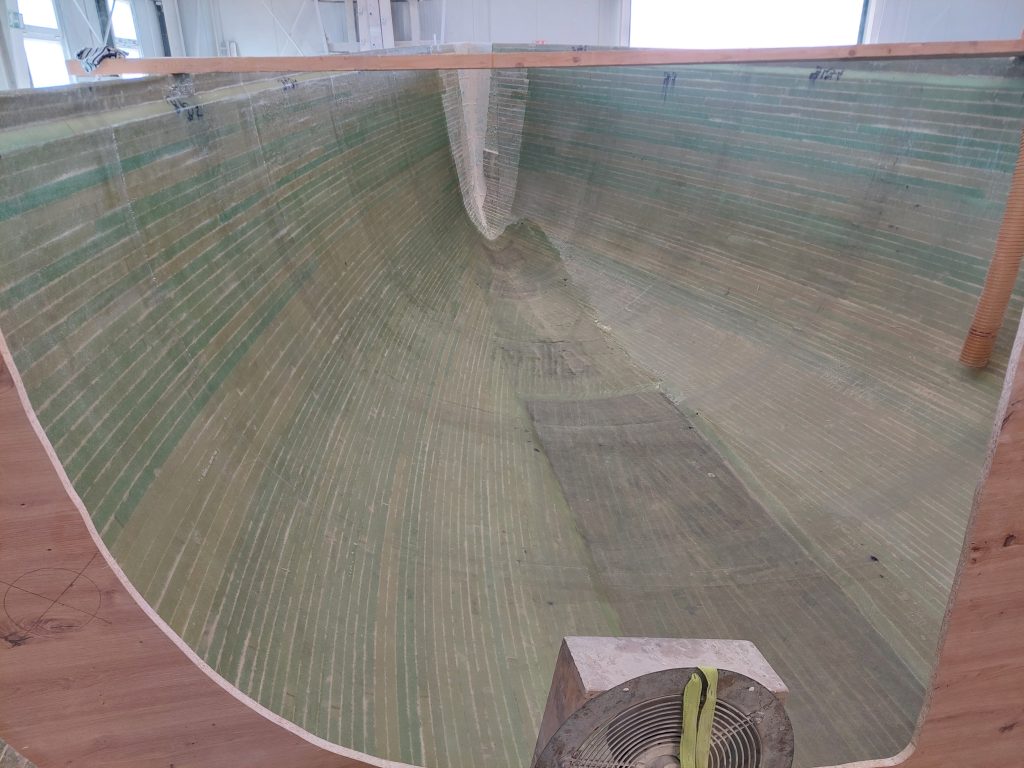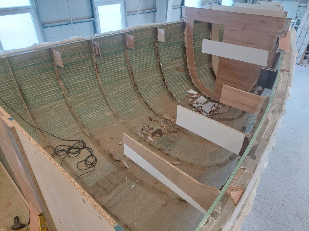 Újabb „nemszeretem munka”!De nagyon fontos, hogy a bordaváz rengeteg faanyagát körültekintően bontsuk ki. Aztán indulnak a belső laminát rétegek, amitől rögtön merev lesz az alsó héj. Persze itt is a…