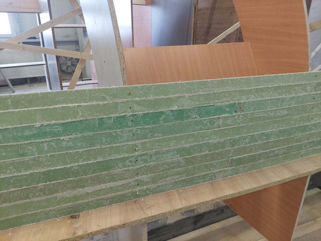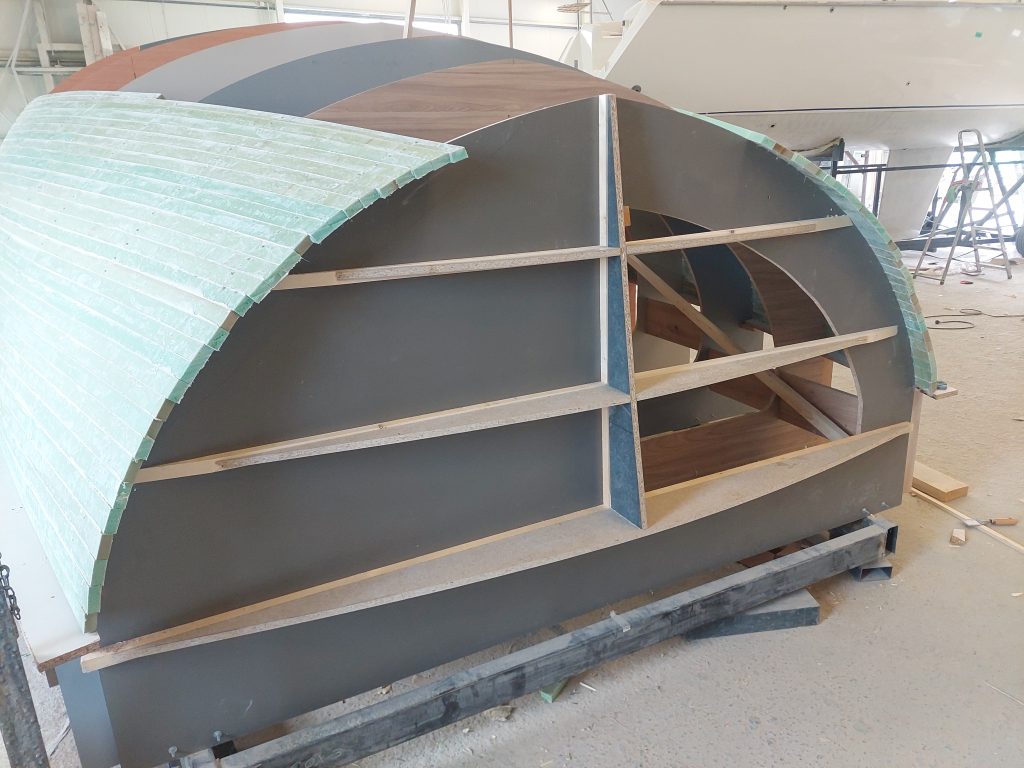 A STRONG PLANC Technológiát fordítottuk át a mi lehetőségeinknek megfelelően, kiválóan működött a Dolphin 38-as és 30-as modelljeinknél is. Most azonban alkalmaztunk egy új elemet, amitől a munkafolyamat lényegesen hosszabb lett, viszont a szerkezet sokkal merevebb és homogénebb. A hajó orránál természetesen az XPS kijött és a helyére duplán átlapolva kerültek fel a rétegek. Nagyjából vasbeton keménységű az orrgerinc, a súly mellékes. A fartükrön szobroztak az asztalosok sokat, mert az eredetileg íves hátfalat a tulajdonos áttervezte pluszban kidöntöttre.