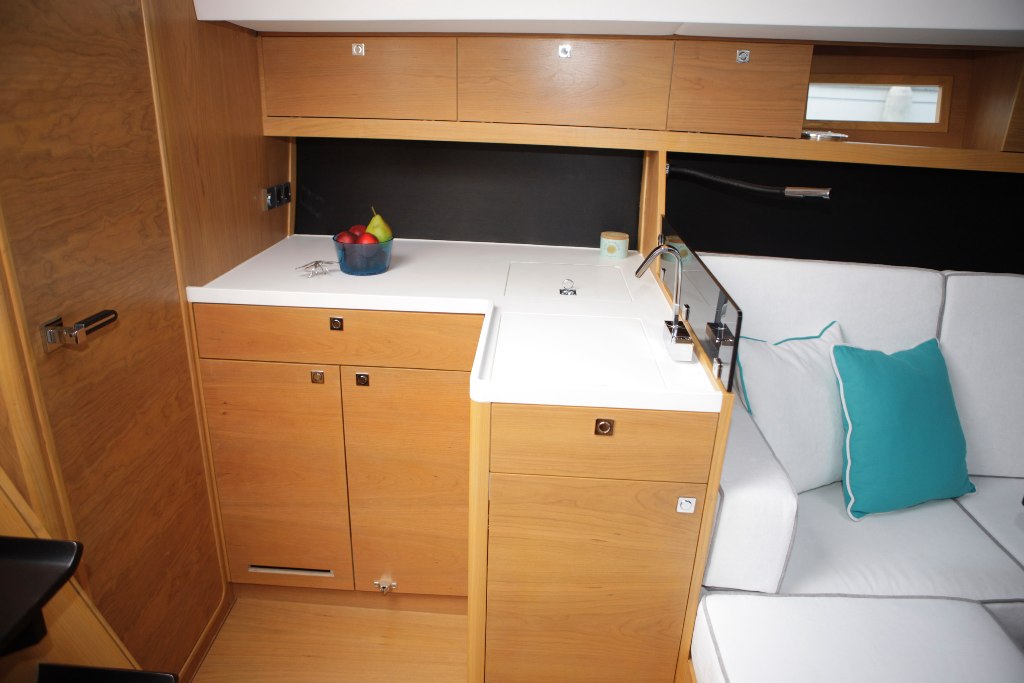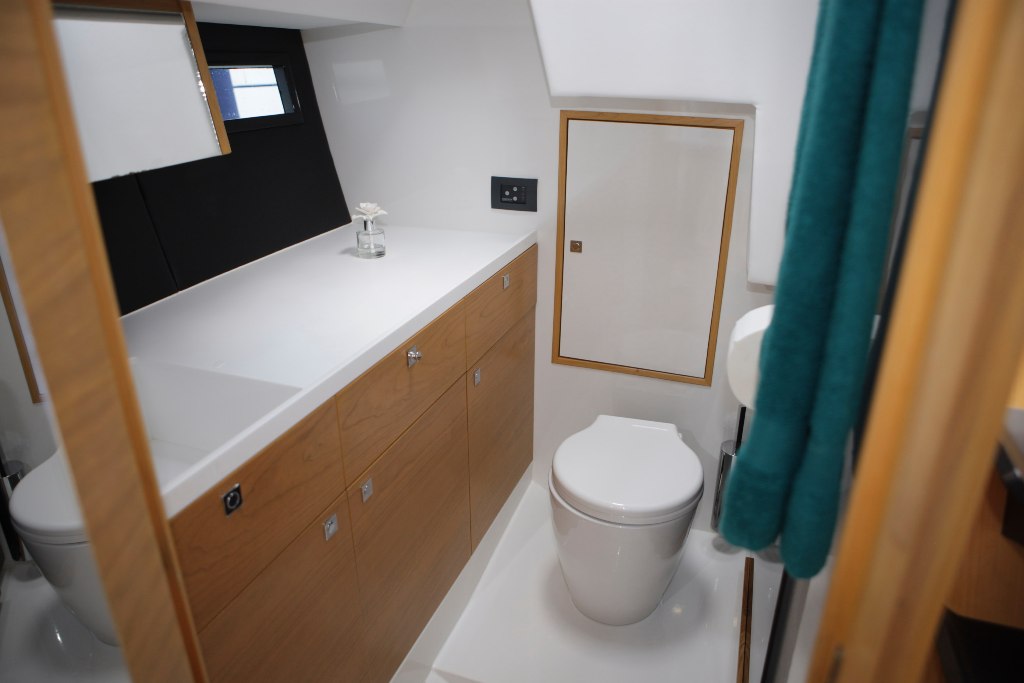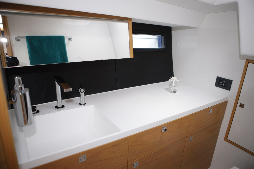 We can find similar design features belowdecks as outside. Interior is simple and elegant with lots of space for everything. Owners layout is built with two comfortable an spacious cabins, galley is part of the salon and there is a head with shower. The charter layout can have three cabins. The two comfortable extra bunks are in a second achter cabin.