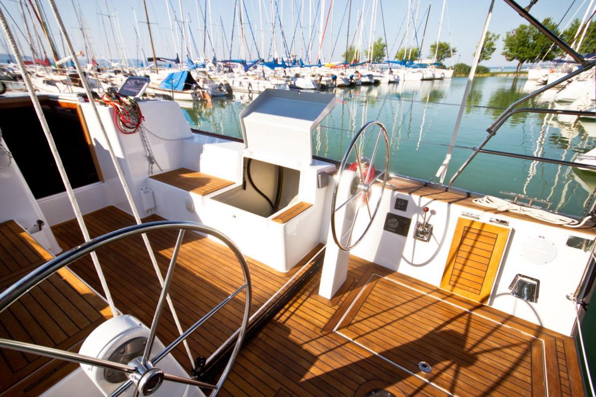 What impress you for the first look is the size of the cockpit. It is huge. Helm positions proved to be well organized. But I should not run this fast. My favourite feature is the design of the the main sheet. The sheet is not led forward on the boom and back on deck to a winch, but on the level of the traveller block disappears in a hole in the side of the cockpit and reappears on the side coaming right behind its dedicated winch. Easy and simple with less rope than usual. Engine controls are situated on the right side of the cockpit and easy to reach from the helmsman. This boat is big for our lake marinas so it is no surprise that a bowthruster is a standard item. After checking everything important we threw our docklines and left for open water for the first time.